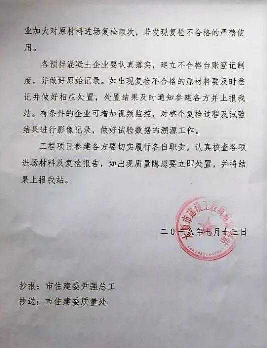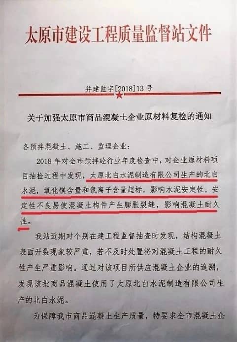 山西省太原市建設(shè)工程質(zhì)量監(jiān)督站此前發(fā)布的《關(guān)于加強(qiáng)太原市商品混凝土企業(yè)原料復(fù)檢的通知》稱,在2018年對(duì)全市預(yù)拌砼行業(yè)年檢時(shí)發(fā)現(xiàn),太原北白水泥制造有限公司生產(chǎn)的北白水泥,氧化鎂含量和氯離子含量超標(biāo),影響水泥安定性,安定性不良易使混凝土構(gòu)件產(chǎn)生膨脹裂縫,影響混凝土耐久性。