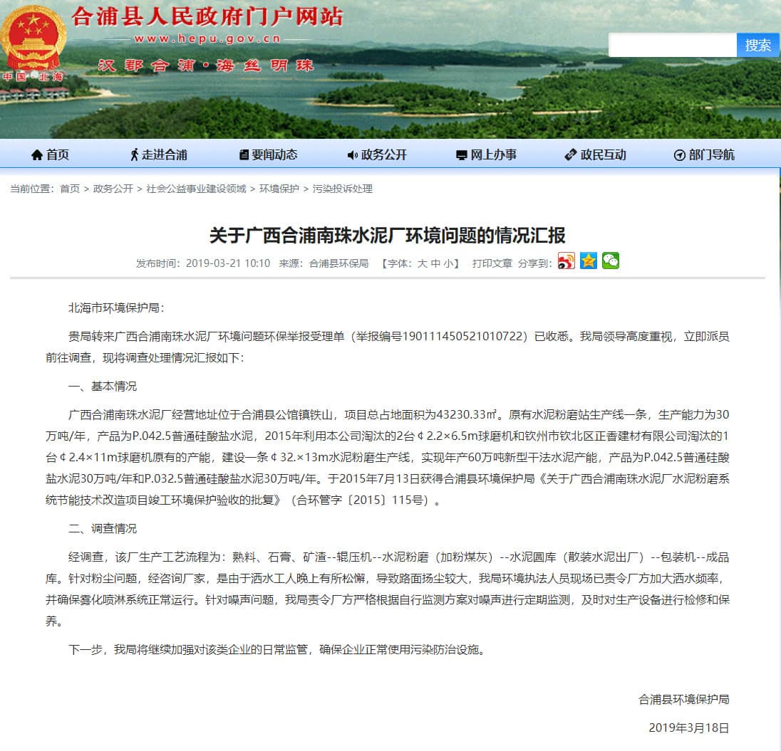 日前,合浦縣人民政府門戶網(wǎng)站發(fā)布了來(lái)源合浦縣環(huán)保局的《關(guān)于廣西合浦南珠水泥廠環(huán)境問(wèn)題的情況匯報(bào)》稱: