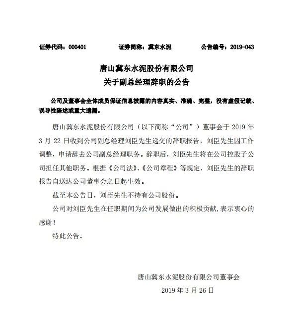 水泥人網(wǎng)消息:昨日(3月26日)冀東水泥發(fā)布公告稱,冀東水泥董事會于2019年3月22日收到公司副總經理劉臣遞交的辭職報告,辭職后,劉臣將在公司控股子公司擔任其他職務。