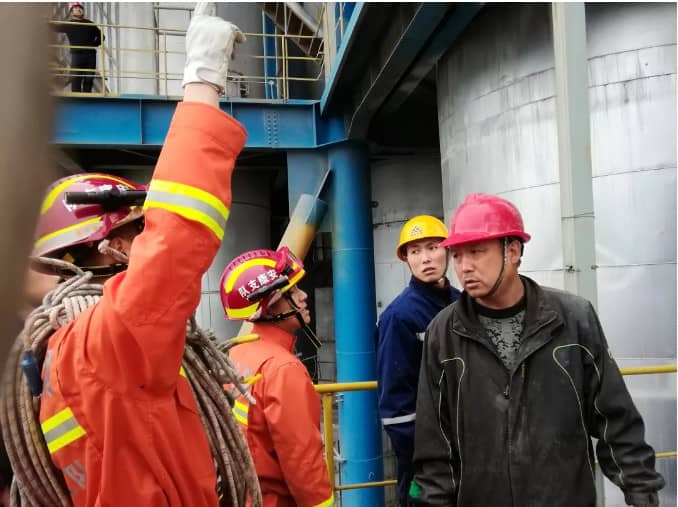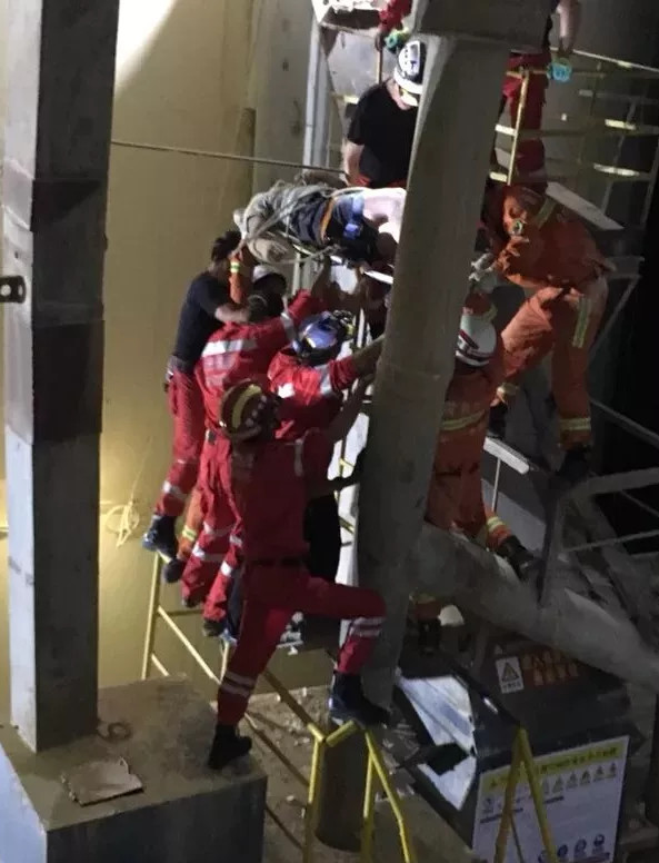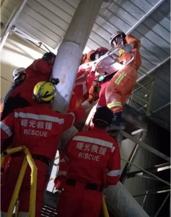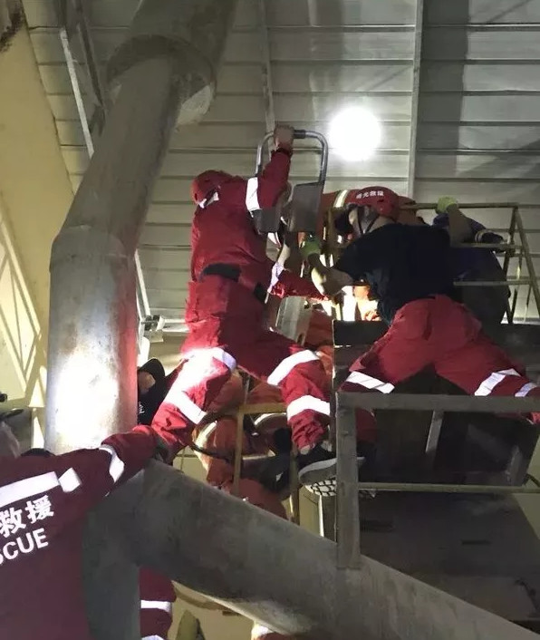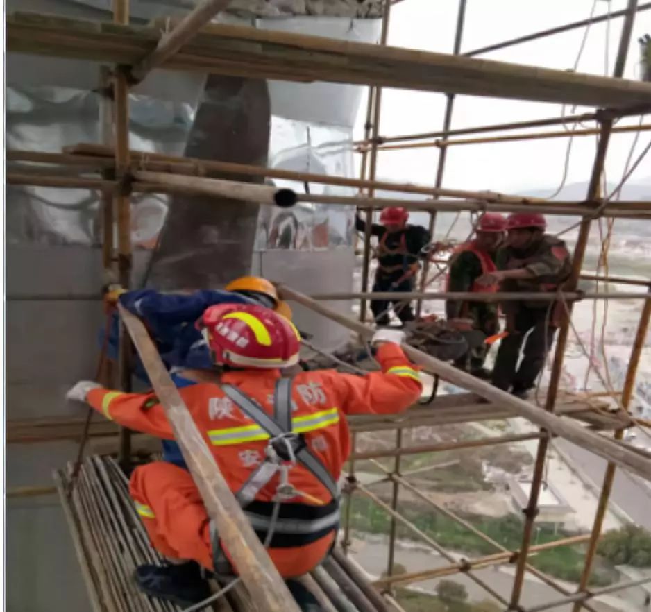 因得知被困人員所在的高空搭架離地面高度約80米,消防指揮員立即下令,由七名消防員攜帶擔(dān)架、攀登繩、掛鉤、四米小繩等前往事故發(fā)生位置,做緊急救援。