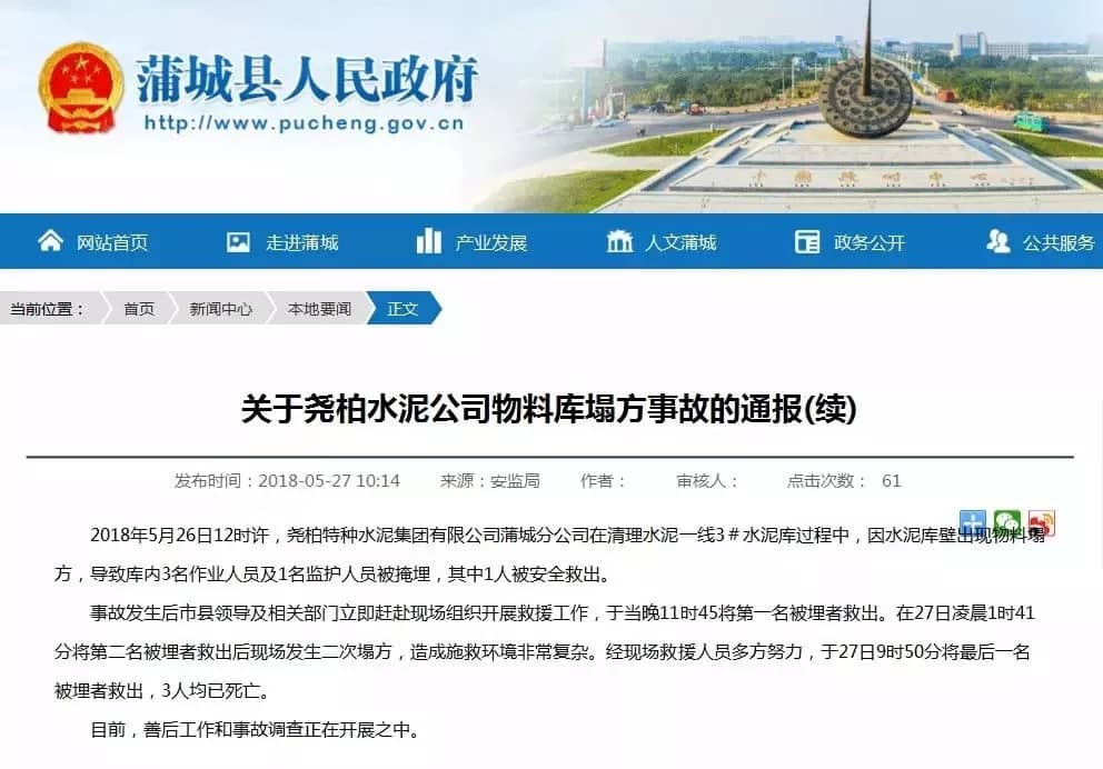 2018年5月26日,堯柏特種水泥集團(tuán)有限公司蒲城分公司制成車間3#水泥庫清庫作業(yè)過程中,發(fā)生庫壁掛料坍塌事故,造成3名工人死亡。