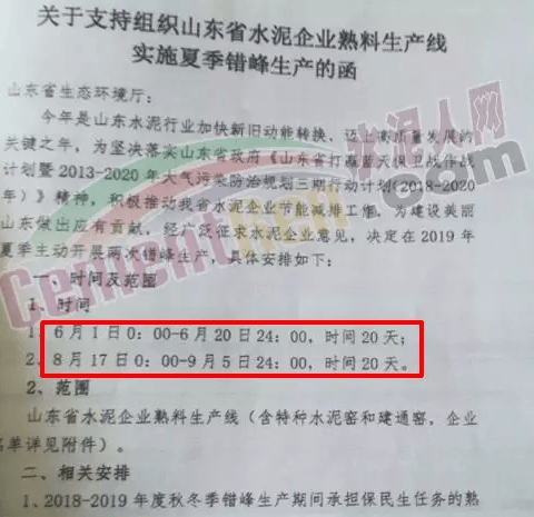 水泥人網(wǎng)消息,山東省2019年水泥企業(yè)熟料生產(chǎn)線(含特種水泥窯和建通窯)夏季錯峰時間已經(jīng)確定,自6月1日起分兩個階段,共計停產(chǎn)40天,具體錯峰停產(chǎn)時間如下: