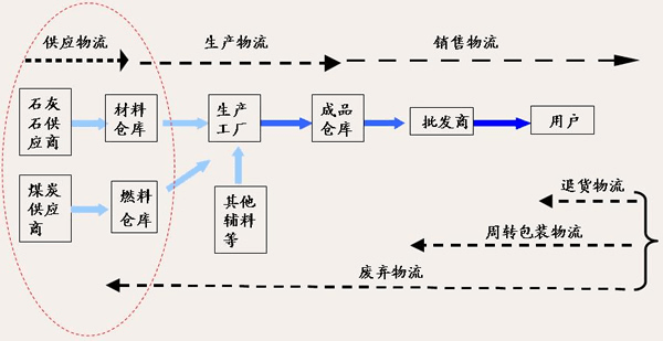 水泥行業(yè)的物流按業(yè)務(wù)環(huán)節(jié)產(chǎn)生先后順序分為供應(yīng)物流、生產(chǎn)物流和銷售物流三部分,如圖1,其中供應(yīng)物流和銷售物流對水泥企業(yè)的影響最大。