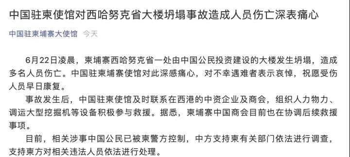 下面是中國駐柬埔寨大使館官方微信公眾號的發(fā)文:中國駐柬使館對西哈努克省大樓坍塌事故造成人員傷亡深表痛心。