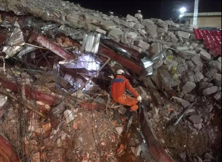現(xiàn)場圖片顯示,戴著安全帽的救援人員穿過地面上的鋼筋水泥,將傷者運送至救護車,同時挖掘機將倒塌后的建筑廢料分流到一邊。大量傷者的親屬則在事故地點附近等待消息。