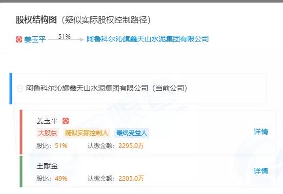 天眼查數(shù)據(jù)顯示:王獻(xiàn)金為阿魯科爾沁旗天山水泥集團(tuán)有限公司法定代表人,擁有企業(yè)49%的股份。同時(shí)擔(dān)任企業(yè)執(zhí)行董事和總經(jīng)理職務(wù)。