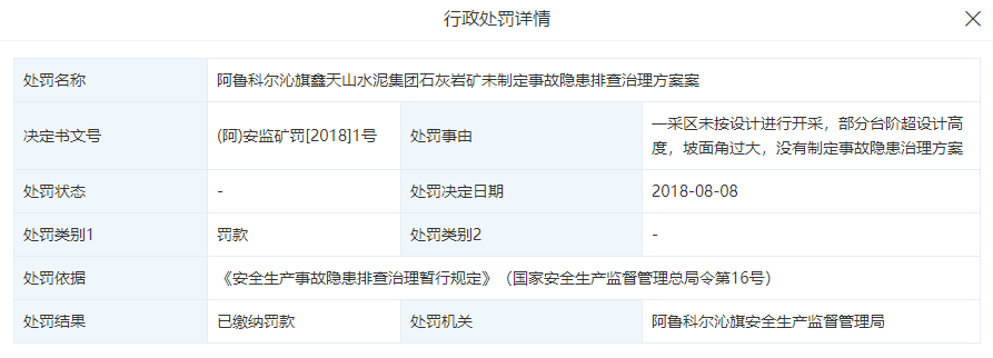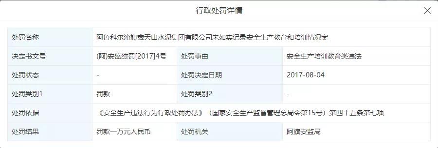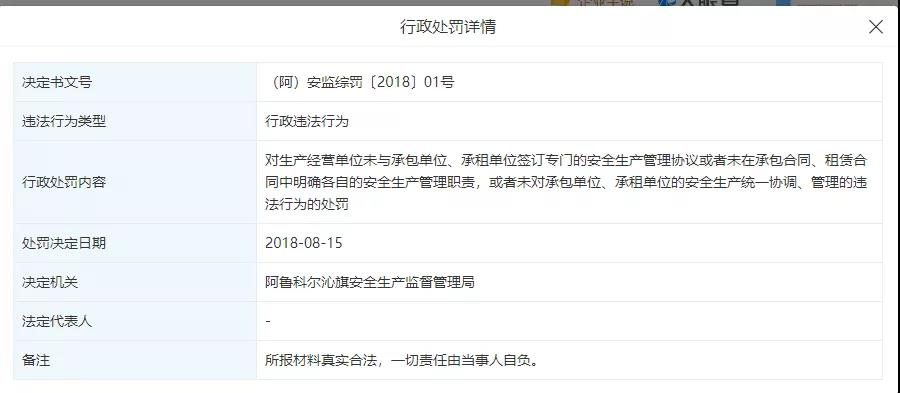 2017年8月4日,阿旗安監(jiān)局曾針對(duì)企業(yè)未如實(shí)記錄安全生產(chǎn)教育和培訓(xùn)情況做出行政罰,罰款一萬(wàn)元人民幣。
