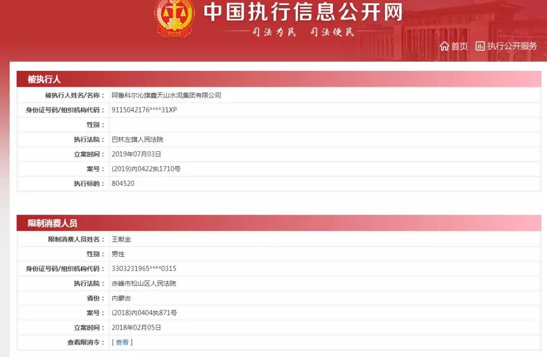 中國(guó)執(zhí)行信息公開(kāi)網(wǎng)信息顯示,被執(zhí)行人為阿魯科爾沁旗鑫天山水泥集團(tuán)有限公司,被限制消費(fèi)人員為王獻(xiàn)金。