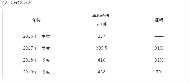 國(guó)家統(tǒng)計(jì)局?jǐn)?shù)據(jù)顯示,自2016年一季度以來(lái),水泥價(jià)格逐年上漲。從2016年季度的237元/噸,到2019年一季度勻價(jià)438元/噸,三年多時(shí)間漲幅達(dá)85%,而整個(gè)水泥行業(yè)的利潤(rùn)從2015年的14.29元/噸提高到2018年的71.29元/噸。