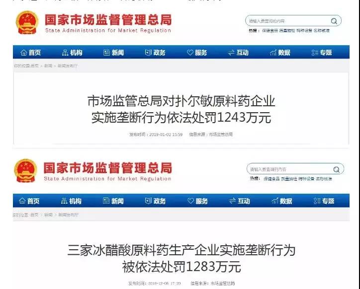 今年年初市場(chǎng)監(jiān)管總局開(kāi)出了今年的首張罰單:1月9日,撲爾敏原料藥企業(yè)湖南爾康醫(yī)藥和河南九勢(shì)制藥就因違反反壟斷法規(guī)定,兩家企業(yè)共被判罰1243.14萬(wàn)元。去年12月6日,三家冰醋酸原料藥生產(chǎn)企業(yè)也因壟斷行為被處罰:沒(méi)收違法所得及罰款共計(jì)1283.38萬(wàn)元。這一處罰也被媒體稱作原料藥領(lǐng)域反壟斷的最大罰單。