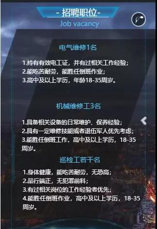 要求:男,中專、高中以上學(xué)歷;電氣相關(guān)專業(yè)或有電工證、有實(shí)際工作經(jīng)驗(yàn)者。年齡18-45歲。工資待遇:3500- 4500元/月。