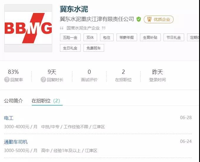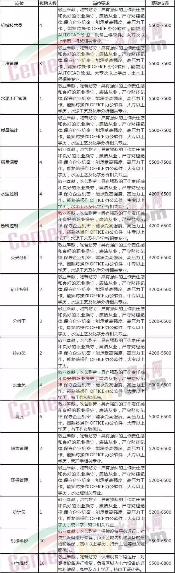 從近期委托水泥人網(wǎng)信息中心發(fā)布招聘信息的企業(yè)來(lái)看,不僅有前20強(qiáng)水泥企業(yè)中建材,海螺、華潤(rùn),華新,金隅冀東,天瑞,山水,臺(tái)泥等也有部分中小企業(yè)欲通過(guò)高薪獵頭招聘有經(jīng)驗(yàn)的管理人員和基層崗位工人。