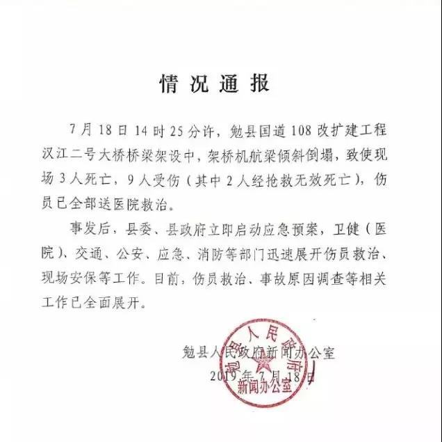 本周四(18日),陜西省漢中市勉縣人民政府發(fā)布通報(bào),當(dāng)日14時(shí)25分許,勉縣國道108改擴(kuò)建工程漢江二號(hào)大橋橋梁架設(shè)中架橋機(jī)航梁倒塌,共造成5死7傷。死傷者皆為施工工人,原因正在調(diào)查中。