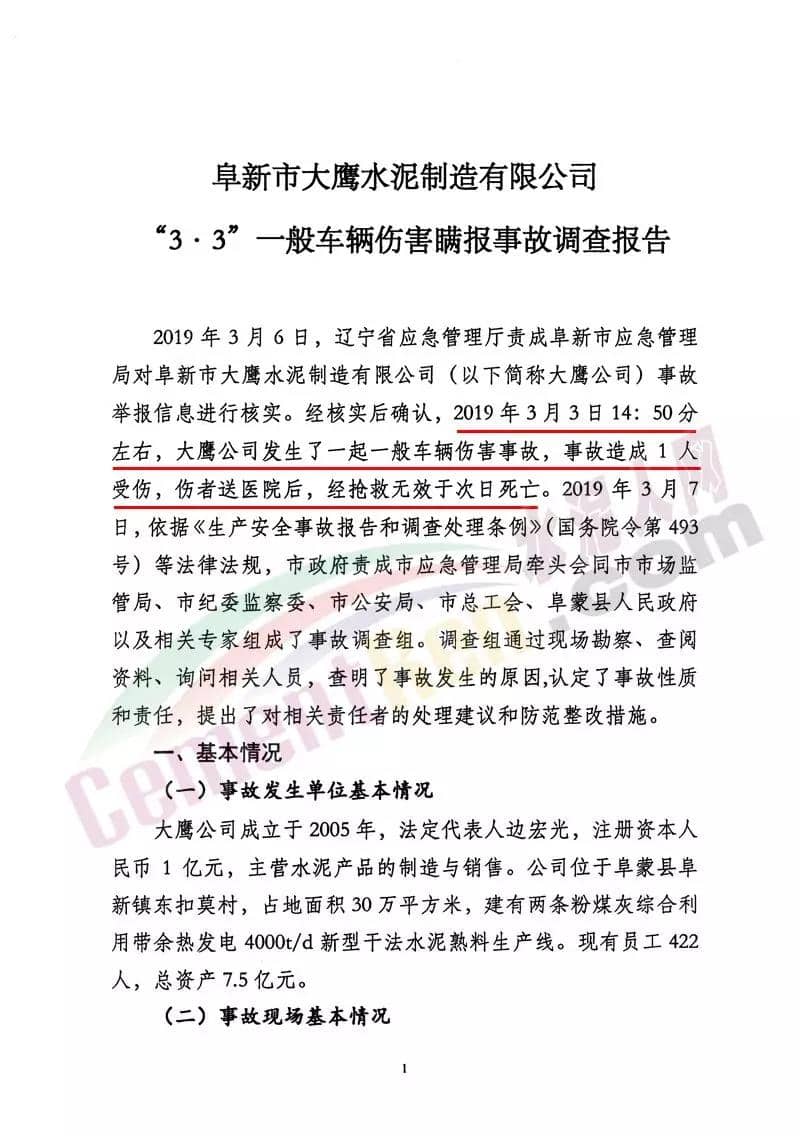 今年3月6日,遼寧省應(yīng)急管理廳責(zé)成阜新市應(yīng)急管理局對(duì)阜新市大鷹水泥制造有限公司事故舉報(bào)信息進(jìn)行核實(shí)。經(jīng)核實(shí)后確認(rèn),3月3日14:50分左右,鷹水泥發(fā)生了一起一般車輛傷害事故,事故造成一人死亡。自3月3日事故發(fā)生后至3月6日市應(yīng)急管理局前往阜蒙縣和大鷹公司核實(shí)事故前,該公司并未主動(dòng)向當(dāng)?shù)卣虬踩O(jiān)管部門報(bào)告事故相關(guān)信息,事實(shí)上形成了事故瞞報(bào)。事故造成1人死亡,直接經(jīng)濟(jì)損失204.2萬元。事故直接原因?yàn)?,大鷹水泥公司看管預(yù)熱器工人劉某沒有叉車作業(yè)人員證,違章作業(yè)。經(jīng)事故調(diào)查組認(rèn)定,本起事故為一般生產(chǎn)安全瞞報(bào)事故。