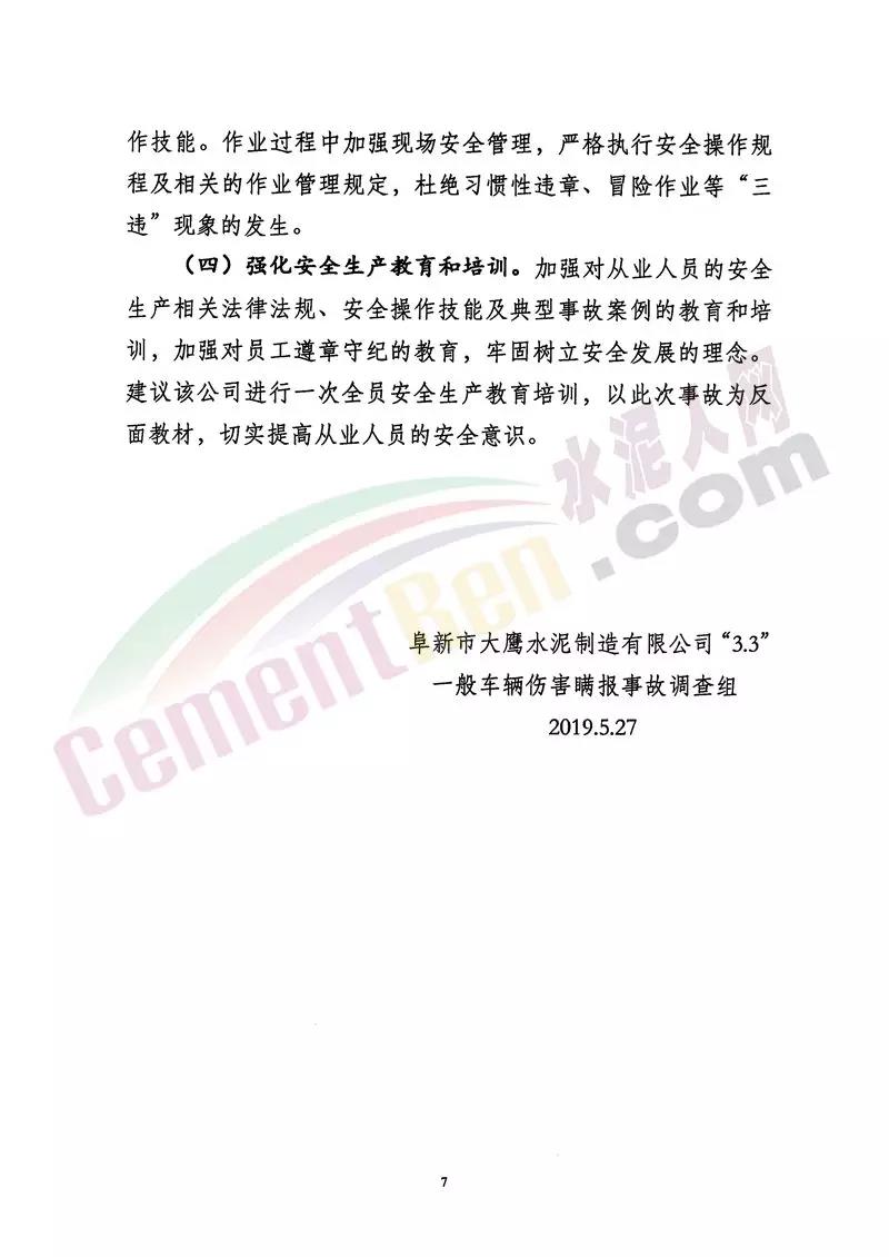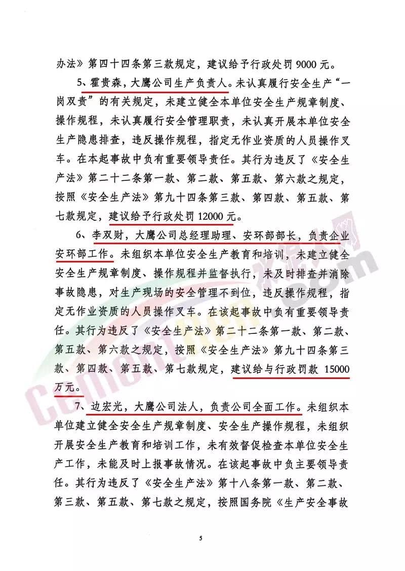 因事故主要責(zé)任人劉某違反《安全生產(chǎn)法》第一百零四條規(guī)定,建議移交司法機(jī)關(guān)處理。陳某,違章指揮,指定沒有叉車作用資質(zhì)的劉某違章作業(yè),是本起事故的主要責(zé)任人,其行業(yè)違反《安全生產(chǎn)法》第一百零四條規(guī)定,建議移交司法機(jī)關(guān)處理。其他相關(guān)人員,處以行政處罰15000-7000元不等,負(fù)責(zé)企業(yè)全面工作的企業(yè)法人建議給予其上一年年收入的60%行政罰款。阜新市大鷹水泥因企業(yè)安全生產(chǎn)主體責(zé)任落實(shí)不到位等違反了《安全生產(chǎn)法》相關(guān)規(guī)定,依據(jù)相關(guān)條例規(guī)定,建議給予合并行政罰款140萬元。