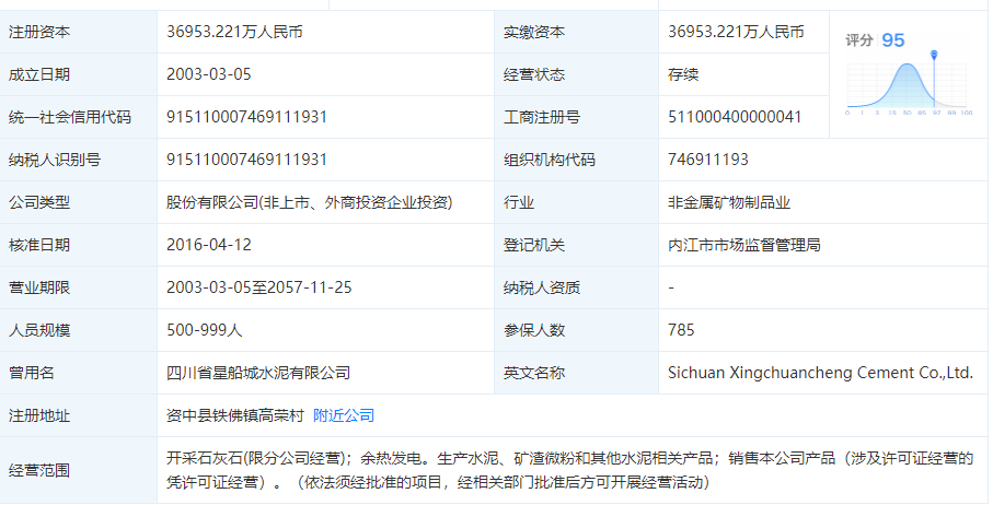 天眼查相關(guān)數(shù)據(jù)顯示:企業(yè)注冊(cè)地址位于資中縣鐵佛鎮(zhèn)高榮村,經(jīng)營(yíng)范圍為開(kāi)采石灰石,余熱發(fā)電,生產(chǎn)水泥,礦渣微粉和其他水泥相關(guān)產(chǎn)品。
