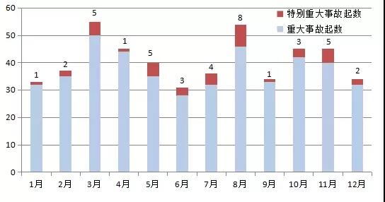 其中,特別重大事故在近十年的8月份發(fā)生最為集中,共發(fā)生8起、死亡480人,占近十年特別重大事故起數(shù)、死亡人數(shù)的20.0%、24.8%;分別比全年月平均值高出11.7和16.5個(gè)百分點(diǎn),在12個(gè)月份中均位列第一位。