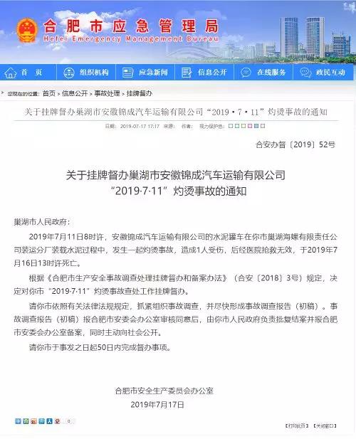 上述事故發(fā)生后,合肥市應(yīng)急管理局于次日發(fā)布關(guān)于掛牌督辦的通知。通知稱,根據(jù)《合肥市生產(chǎn)安全事故調(diào)查處理掛牌督辦和備案辦法》(合安〔2018〕3號)規(guī)定,決定對巢湖市“2019·7·11”灼燙事故查處工作掛牌督辦。并請巢湖市依照有關(guān)法律法規(guī)規(guī)定,抓緊組織事故調(diào)查,并盡快形成事故調(diào)查報告(初稿)。