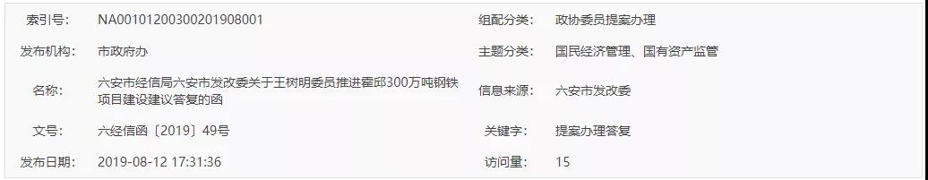 關(guān)于王樹明委員推進(jìn)霍邱300萬噸鋼鐵項(xiàng)目建設(shè)建議答復(fù)的函