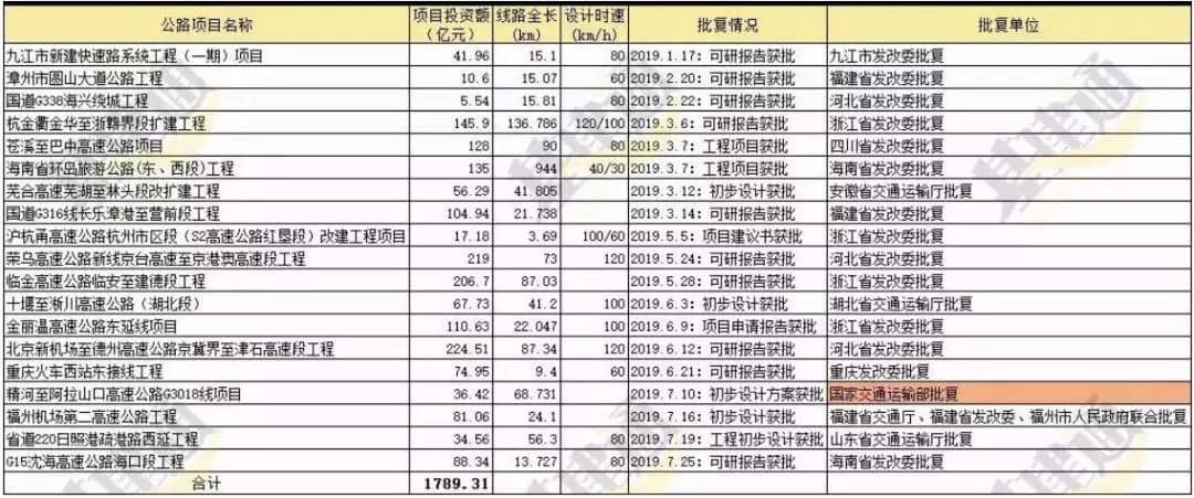 2019年1-7月,國家交通運輸部、福建/河北/浙江/四川/海南/安徽/湖北/山東/重慶等省市發(fā)改委共批復(fù)了約19條的公路項目可研報告、初步設(shè)計及項目建議書等,涉及項目投資額約1789億。具體的批復(fù)項目如下: