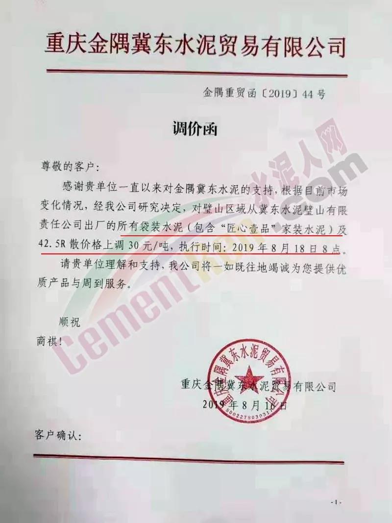 日前,重慶區(qū)域主導(dǎo)企業(yè)冀東水泥發(fā)布調(diào)價函稱:根據(jù)目前市場變化情況,經(jīng)公司研究決定,對主城區(qū)及璧山區(qū)域從冀東水泥璧山有限責(zé)任公司出廠的所有袋裝水泥(包含“匠心壹品”家裝水泥)及42.5R散價格上調(diào)30元/噸,執(zhí)行時間2019年8月18日8點。調(diào)價通知如下: