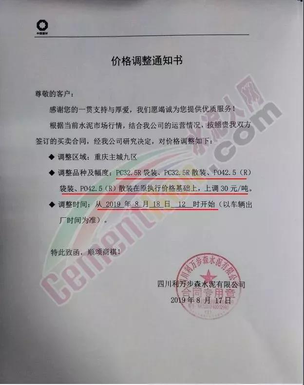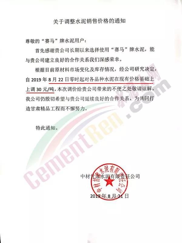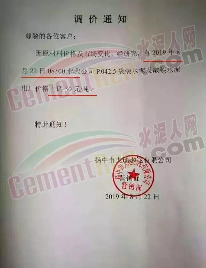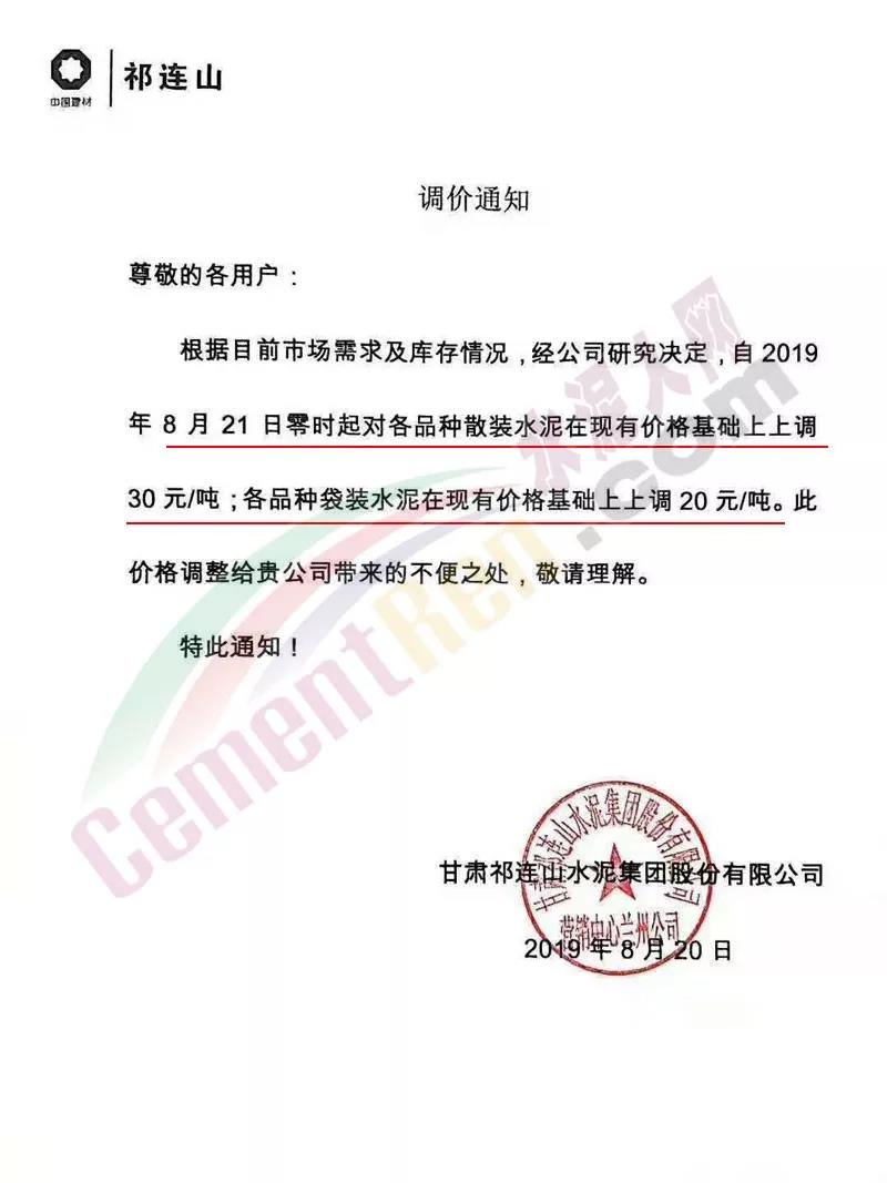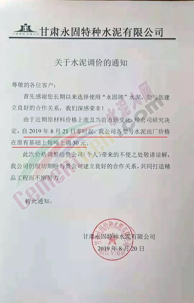 根據(jù)當(dāng)前市場形勢經(jīng)我公司研究決定,自2019年08月22日上午9:00點(diǎn)起所有水泥品種價(jià)格統(tǒng)一上調(diào)30元/噸。