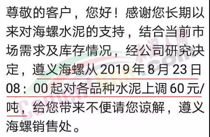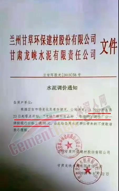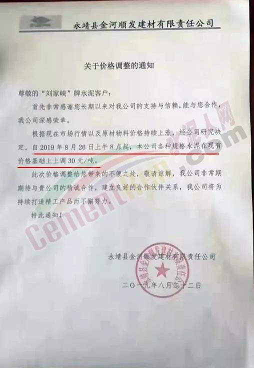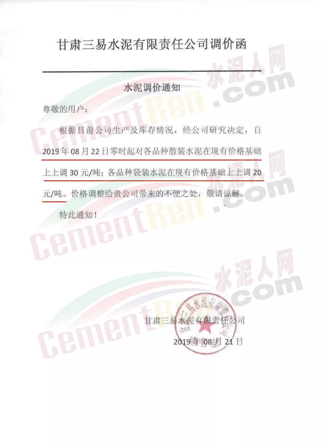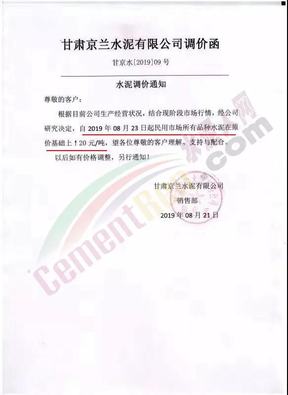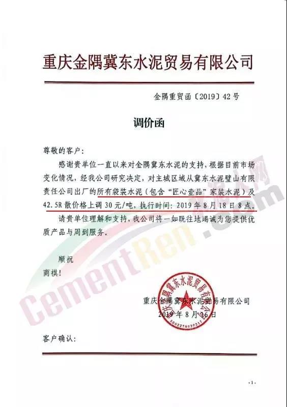 根據(jù)當(dāng)前市場形勢經(jīng)我公司研究決定,自2019年08月22日上午9:00點(diǎn)起所有水泥品種價(jià)格統(tǒng)一上調(diào)30元/噸。