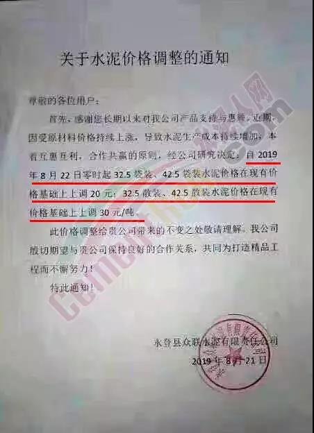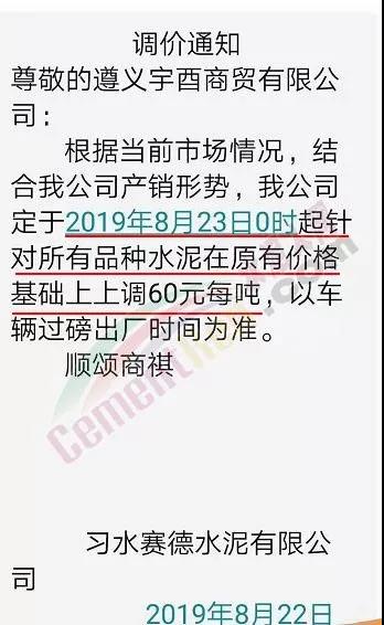 因近期原燃材料成本上漲,我公司現(xiàn)決定于2019年8月22日8:00針對PO42.5散裝價(jià)格進(jìn)行調(diào)整,價(jià)格上調(diào)60元/噸。