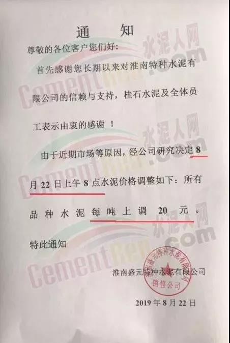 結(jié)合當(dāng)前周邊市場行情,經(jīng)公司商議決定自2019年8月22日上午9:30分整,32.5水泥袋裝、散裝在原價(jià)格基礎(chǔ)上每噸上調(diào)10元;42.5水泥袋裝、散裝在原價(jià)格基礎(chǔ)上每噸上調(diào)10元,特此通知!