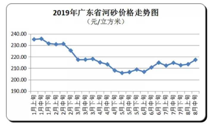 8月中旬,全省河砂平均購(gòu)進(jìn)價(jià)為每立方米217元,環(huán)比上升1.8%(與2019年8月上旬相比,下同)。其中,粵西和珠三角地區(qū)購(gòu)進(jìn)價(jià)漲幅較大,均價(jià)分別為每立方米220元和200元,環(huán)比分別上升3.53%和3.61%。