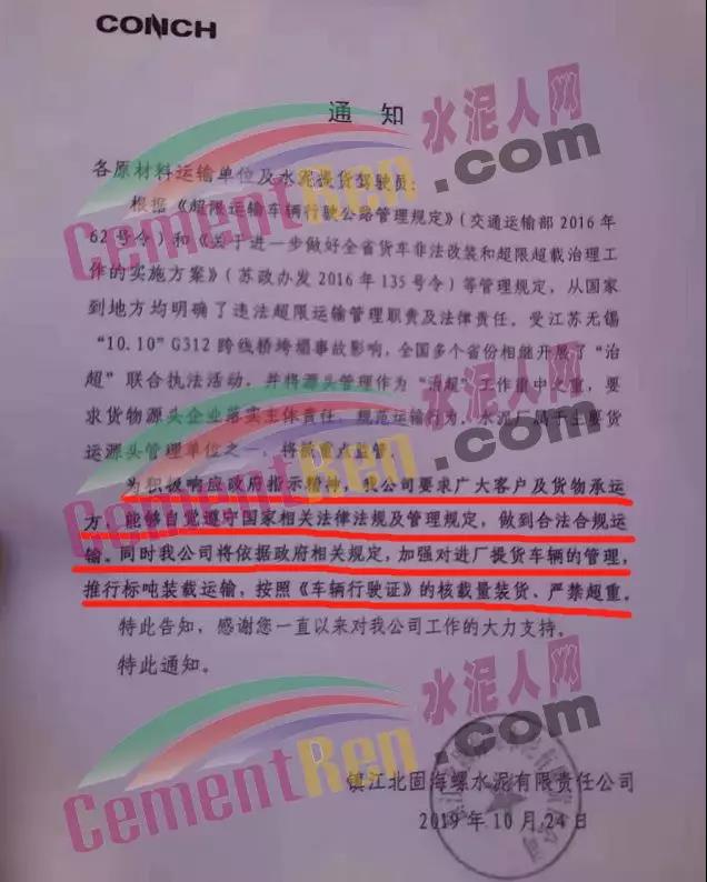 海螺水泥向超載開刀 同時鎮(zhèn)江北固海螺水泥發(fā)布通知稱:為積極響應(yīng)政府指示精神,鎮(zhèn)江北固海螺水泥要求廣大客戶及貨物承運方,能夠自覺遵守國家相關(guān)法律法規(guī)及管理規(guī)定,做到合法合規(guī)運輸。同時,鎮(zhèn)江北固海螺水泥將依據(jù)政府相關(guān)規(guī)定,加強對進廠提貨車輛的管理,推行標噸裝載運輸,按照《車輛行駛證》的核載量裝貨,嚴禁超重。