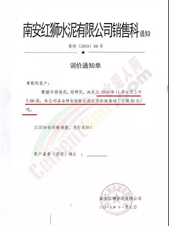 根據(jù)市場情況,經研究,決定從2019年11月8日零時起,本公司發(fā)往福建省內各品種各規(guī)格型號水泥在原價格基礎上上調30元/噸。