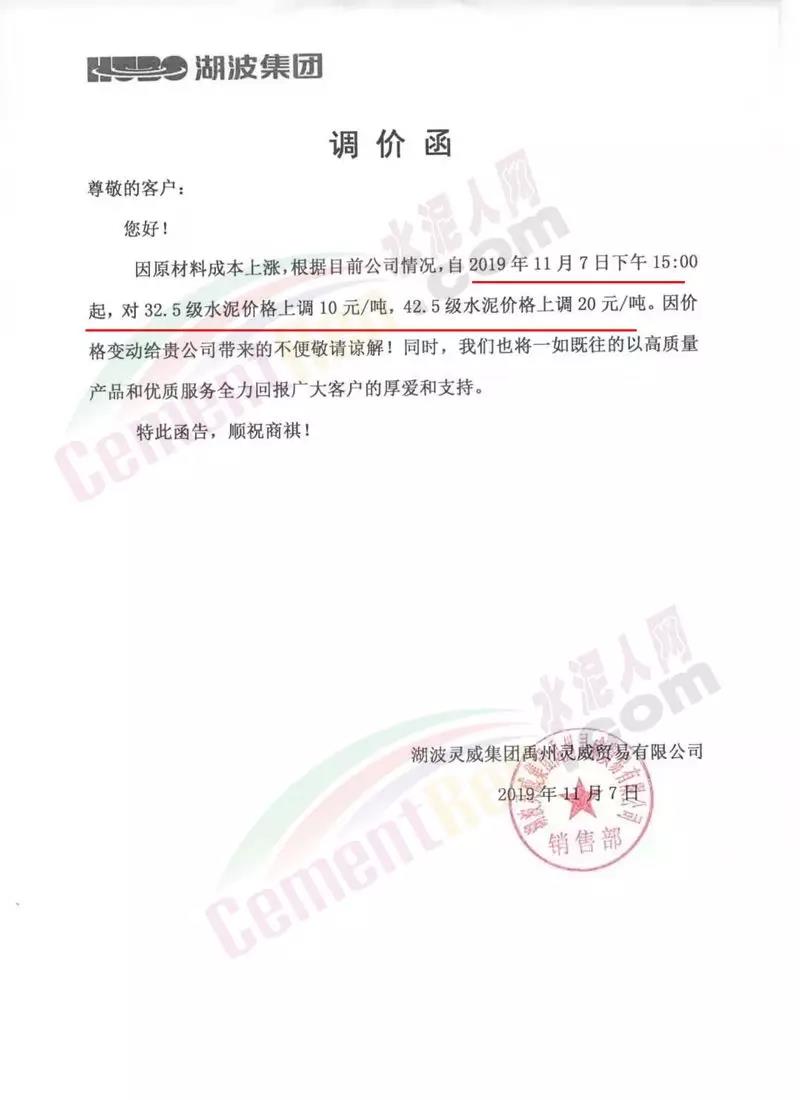 同期,區(qū)域主導企業(yè)湖波水泥也上調了水泥價格。調價通知如下: