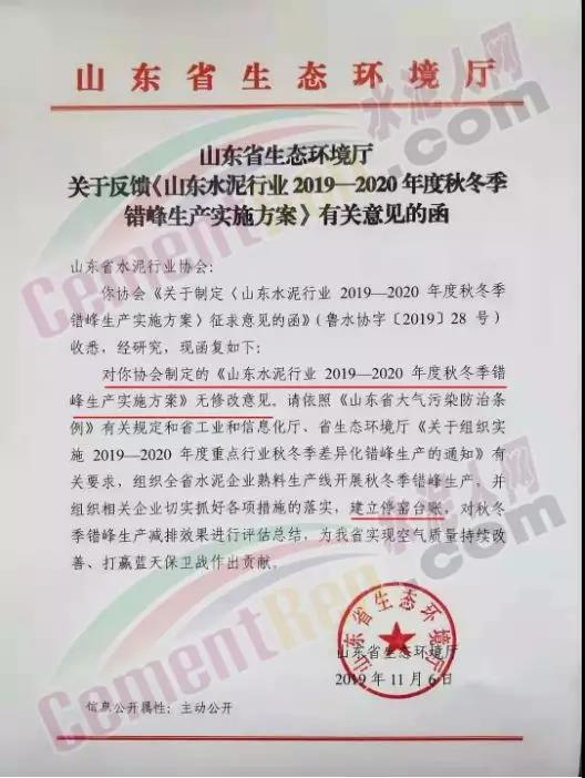 晉冀魯豫(京津冀2+26城市)即將停窯11月6日山東省水泥行業(yè)協(xié)會收到山東省生態(tài)環(huán)境廳的復函稱對其提交的2019-2020采暖季錯峰生產計劃方案無修改意見。山東省區(qū)域內熟料生產企業(yè)從2019年11月15日0時-2020年3月15日24時實施錯峰生產。其中2018年11月15日-2019年10月31日期間,積極落實秋冬季錯峰生產、夏季錯峰生及各市統(tǒng)一組織的環(huán)境污染減排任務,錯峰生產總時間超過160天的企業(yè),可按照實際超出天數(shù)延遲錯峰生產,但最遲應于2019年12月1日0時開始實施錯峰生產。據(jù)山東省65家熟料生產企業(yè)中有45家企業(yè)可延遲實施錯峰生產,山東水泥廠、棗莊中聯(lián)水泥等于11月30日起停限產,泰安中聯(lián)、濟寧中聯(lián)、濟寧山水、臨沂中聯(lián)等自2019年12月1日起停限產。