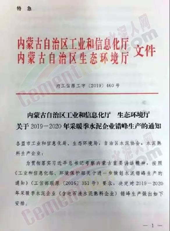 11月6日,內蒙古自區(qū)工信廳聯(lián)合自治區(qū)生態(tài)環(huán)境廳一起發(fā)布特急文件《關于2019-2020年采暖季水泥企業(yè)錯峰生產的通知》。文件要求內蒙古自治區(qū)境內所有水泥熟料生產企業(yè)包括利用電石渣生產水泥熟悉的企業(yè)停限產。且鼓勵水泥熟料企業(yè)在自愿的前提下,延長增加錯峰生產的時間。2019年至2020年度錯峰生產時間為2019年11月15日至2020年3月15日共4個月全面實行錯峰生產。