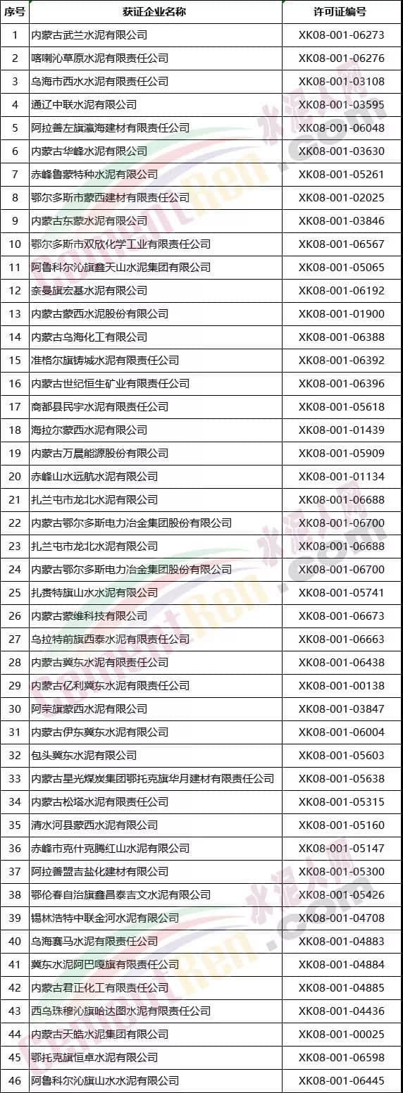 內蒙古自治區(qū)部分水泥熟料生產企業(yè)名單
