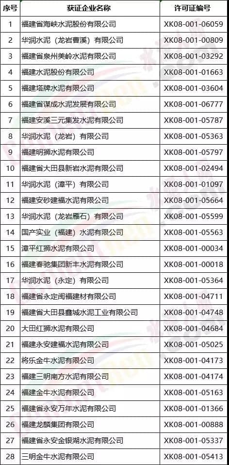 福建省部分水泥熟料生產企業(yè)名單