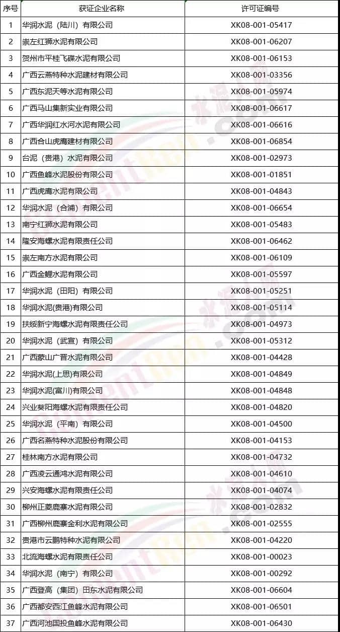 廣西省部分熟料生產企業(yè)名單