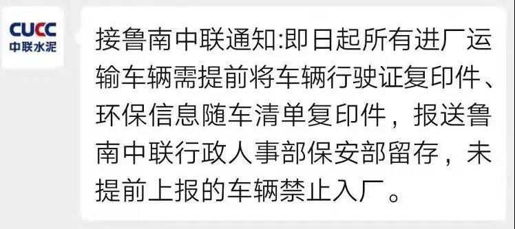 魯南中聯(lián)水泥通知所有進廠運輸車輛需提前將車輛行駛證復印件,環(huán)保信息隨車清單復印件,報送行政人事部保安部留存,未提前上報的車輛禁止入廠。據(jù)水泥人網(wǎng)了解,山東絕大多數(shù)企業(yè)自上月下旬開始執(zhí)行限量供應(yīng)以保供重點項目。日前,水泥人網(wǎng)轉(zhuǎn)發(fā)了《山東水泥行業(yè)2019-2020年度秋冬季錯峰生產(chǎn)實施方案》(相關(guān)鏈接:定了!山東省所有水泥企業(yè)11月15日停產(chǎn)4個月!),消息一經(jīng)發(fā)出山東周邊河北、河南等多區(qū)域都沸騰了。截止目前泛東北區(qū)域遼寧、黑龍江、內(nèi)蒙古以及山東、山西等多區(qū)域已經(jīng)提前發(fā)布了采暖季錯峰生產(chǎn)計劃。河南省也早在2月下旬發(fā)布的大氣污染防治攻堅實施方案中就提到了11月、12月份停窯。