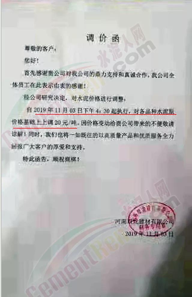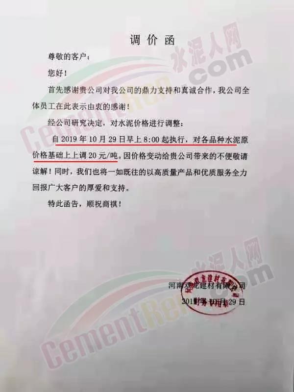 根據(jù)當前市場形勢及產(chǎn)銷存實際情況,經(jīng)公司研究決定,定于2019年11月9日08:00起對各品種袋裝水泥價格上調(diào)20元/噸,對各品種散裝水泥價格上調(diào)30元/噸。