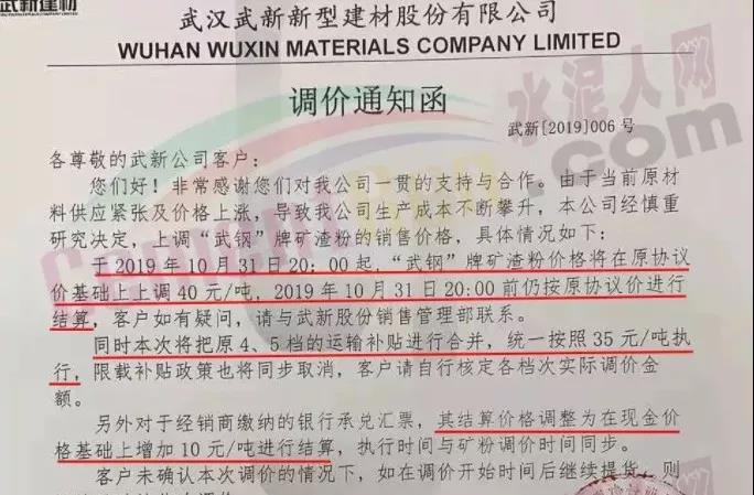 同期,武漢武新新型建材股份有限公司發(fā)調(diào)價通知上調(diào)“武鋼”礦渣粉價格40元/噸。