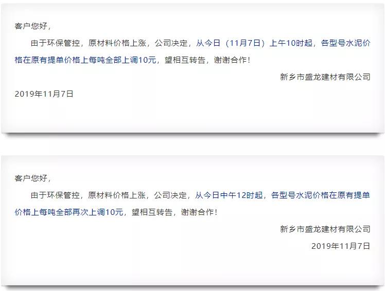 11月7日新鄉(xiāng)市盛龍建材有限公司一日內(nèi)兩次發(fā)布調(diào)價通知,共上調(diào)20元/噸。自此拉開了河南區(qū)域本月連漲的序幕。