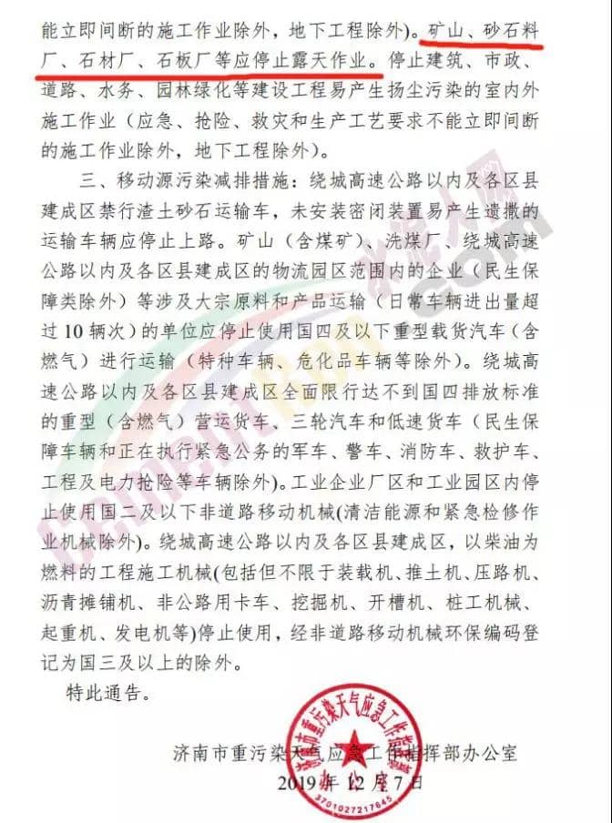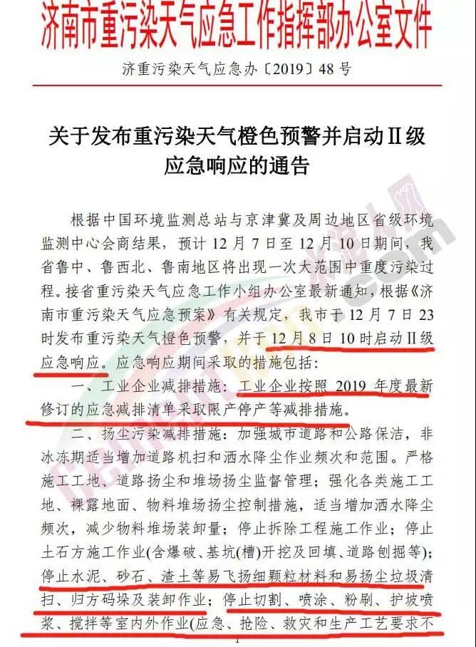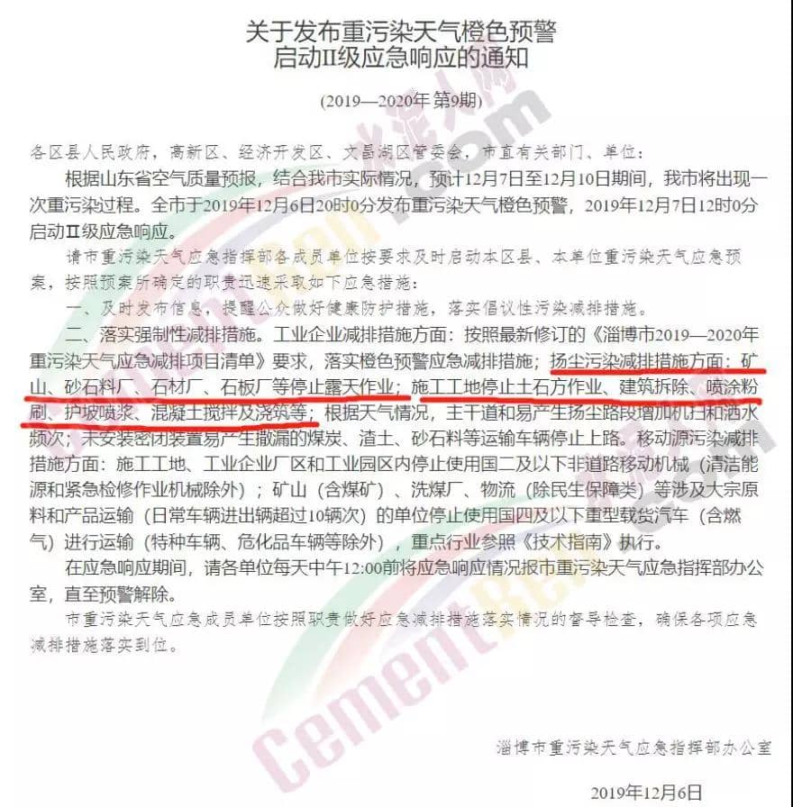 淄博市發(fā)布《重污染天氣橙色預(yù)警,啟動(dòng)Ⅱ級(jí)應(yīng)急響應(yīng)的通知》,礦山、砂石料廠、石材廠、石板廠等停止露天作業(yè);施工工地停止土石方作業(yè)、建筑拆除、噴涂粉刷、護(hù)坡噴漿、混凝土攪拌及澆筑等;