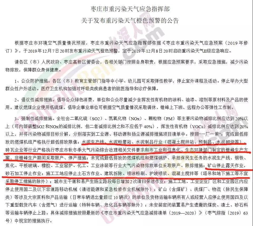 棗莊市重污染天氣應(yīng)急指揮部發(fā)布關(guān)于發(fā)布重污染天氣橙色預(yù)警的公告,稱水泥生產(chǎn)線、水泥粉磨站、水泥制品行業(yè)(混凝土攪拌站、預(yù)制品、水泥砌塊等)、磚瓦企業(yè)等行業(yè)嚴(yán)格執(zhí)行棗莊市秋冬季大氣污染綜合治理相關(guān)文件要求和市工業(yè)和信息化、生態(tài)環(huán)境部門制定的錯(cuò)峰生產(chǎn)方案,非錯(cuò)峰生產(chǎn)期間采取限產(chǎn)、停產(chǎn)措施;未完成超低排放的燃煤機(jī)組和燃煤鍋爐、承擔(dān)保民生任務(wù)的水泥生產(chǎn)線、鋼鐵、焦化、平板玻璃、橡膠、工業(yè)窯爐、化工、工業(yè)涂裝等行業(yè)大氣污染物排放單位采取限產(chǎn)、限排措施;礦山停止露天作業(yè),砂石加工停止作業(yè);施工工地應(yīng)停止土石方作業(yè)、建筑拆除、噴涂粉刷、護(hù)坡噴漿、混凝土攪拌等(塔吊和地下施工等不宜采取停工措施的除外);城市主干道和易產(chǎn)生揚(yáng)塵路段每日增加2次清掃保潔作業(yè);