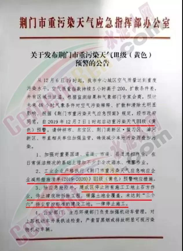 湖北荊門市重污染天應(yīng)急指揮部辦公室發(fā)布《荊門市重污染天氣III級(jí)(黃色)預(yù)警的公告》稱,自12月6日19時(shí)起,荊門市中心城區(qū)空氣質(zhì)量達(dá)到重度污染水平,經(jīng)市政府同意,自2019年12月7日1時(shí)起啟動(dòng)重污染天氣III級(jí)預(yù)警。除應(yīng)急搶險(xiǎn)外,建成區(qū)停止所有施工工地土石方作業(yè),停止建筑物拆除工程,裸露土全覆蓋,未達(dá)到“三六”揚(yáng)塵管控標(biāo)準(zhǔn)的建設(shè)工地,一律停止施工。