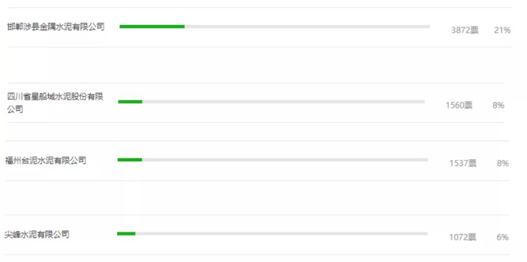 一、邯鄲涉縣金隅水泥3872票。二、四川星船城水泥股份有限公司1560票。三、福州臺泥水泥有限公司位居前三位1537票。四、尖峰水泥1072票。五、漢中西鄉(xiāng)堯柏水泥有限公司988票。六、曲寨水泥有限公司883票。七、邢臺金隅冀東水泥有限公司874票。八、華潤水泥(彌渡)有限公司808票。九、陜西富平生態(tài)水泥有限公司806票。十、貴定海螺盤江水泥有限責(zé)任公司764票。