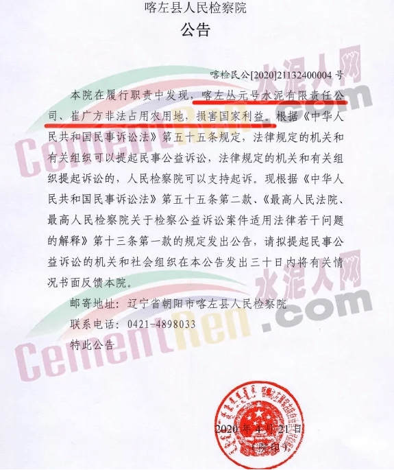 據(jù)水泥人網(wǎng)了解,4月21日,遼寧省朝陽(yáng)市喀左縣人民檢察院在履行職責(zé)中發(fā)現(xiàn),喀左叢元號(hào)水泥有限責(zé)任公司、崔廣方非法占用農(nóng)用地,損害國(guó)家利益。根據(jù)《中華人民共和國(guó)民事訴訟法》第五十五條規(guī)定,法律規(guī)定的機(jī)關(guān)和有關(guān)組織可以提起民事公益訴訟,法律規(guī)定的機(jī)關(guān)和有關(guān)組織提起訴訟的,人民檢察院可以支持起訴。