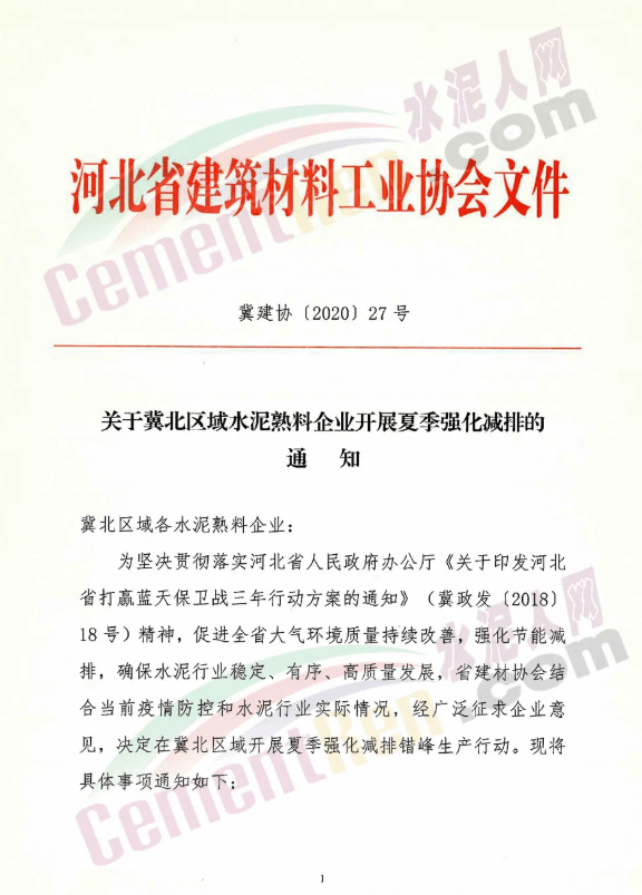 日前,河北省建筑材料工業(yè)協(xié)會(huì)分別發(fā)布了冀北區(qū)域、冀中南區(qū)域水泥熟料企業(yè)開展夏季強(qiáng)化減排的通知。要求區(qū)域內(nèi)水泥熟料企業(yè)開展夏季強(qiáng)化減排錯(cuò)峰生產(chǎn)行動(dòng)。并提出強(qiáng)化減排錯(cuò)峰生產(chǎn)期間,各企業(yè)應(yīng)做好設(shè)備檢修、人員培訓(xùn)等工作,夯實(shí)公司基礎(chǔ)管理,提升企業(yè)運(yùn)行質(zhì)量。