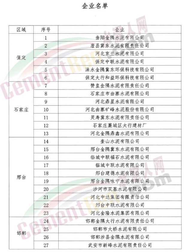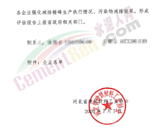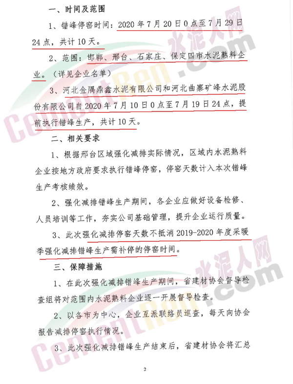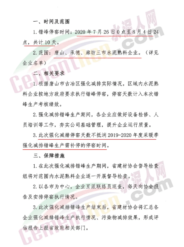 邯鄲、邢臺(tái)、石家莊、保定四市水泥熟料企業(yè)從2020年7月20日0時(shí)至7月29日24時(shí),共停10天。其中,河北金隅鼎鑫水泥有限公司和河北曲寨礦峰水泥股份有限公司已于2020年7月10日0時(shí)至7月19日24時(shí),提前執(zhí)行錯(cuò)峰生產(chǎn),共計(jì)10天;根據(jù)邢臺(tái)區(qū)域強(qiáng)化減排實(shí)際情況,區(qū)域內(nèi)水泥熟料企業(yè)按地方政府要求執(zhí)行錯(cuò)峰停窯,停窯天數(shù)計(jì)入本次錯(cuò)峰生產(chǎn)考核績效。原文件如下: