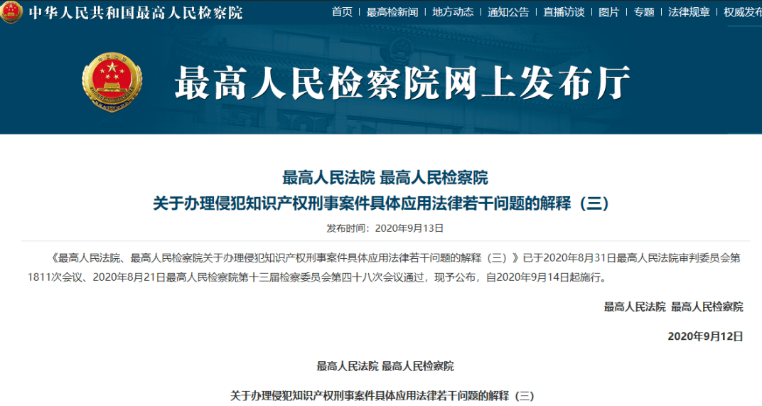 而《最高人民法院、最高人民檢察院關(guān)于辦理侵犯知識(shí)產(chǎn)權(quán)刑事案件具體應(yīng)用法律若干問題的解釋(三)》于近日發(fā)布,自2020年9月14日起施行。